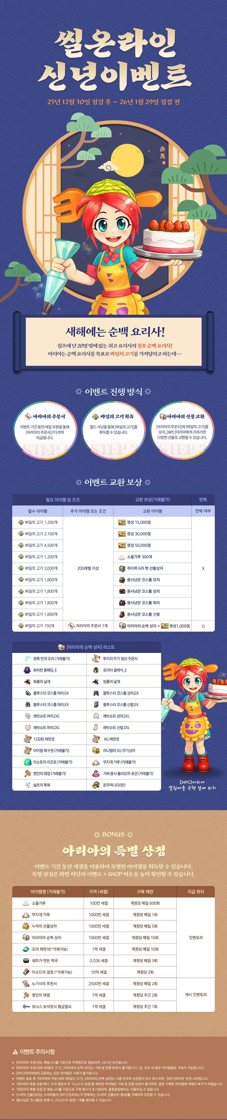 각 이벤트의 내용과 기간, 참여 조건은 씰온라인 홈페이지의 해당 이벤트 페이지를 통해 확인해 주시기 바랍니다.